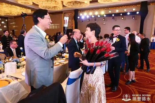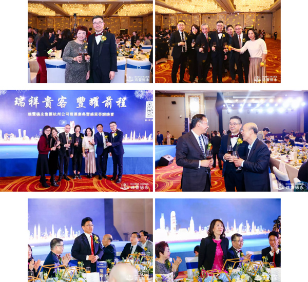 随后的感恩答谢晚宴在杭州洲际酒店举行,政协杭州市副主席、浙江省工商联副主席、杭州市工商联主席冯仁强主席,香港特区政府驻浙江联络处廖凤娴主任,政协浙江省第九届委员会徐鸿道副主席,中国香港(地区)商会会长萧惠君女士,香港贸发局华中华东代表钟永喜先生等浙港两地领导、金融机构、商会组织、律师事务所、优秀知名企业家等300余位特邀嘉宾盛装出席。觥筹交错间,中国香港(地区)商会会长萧惠君女士、香港贸发局华中华东代表钟永喜先生分别上台致辞,与现场嘉宾们一起为瑞丰德永送去了真挚的祝福,并表达了对集团未来的希冀与美好祝愿。