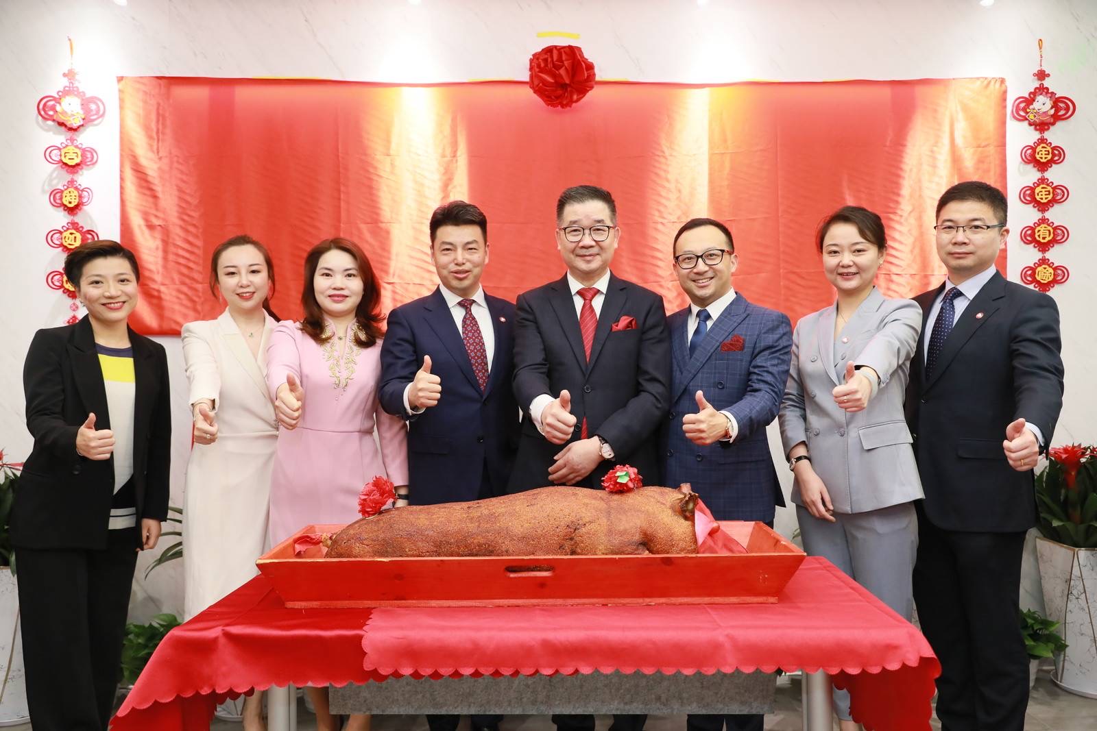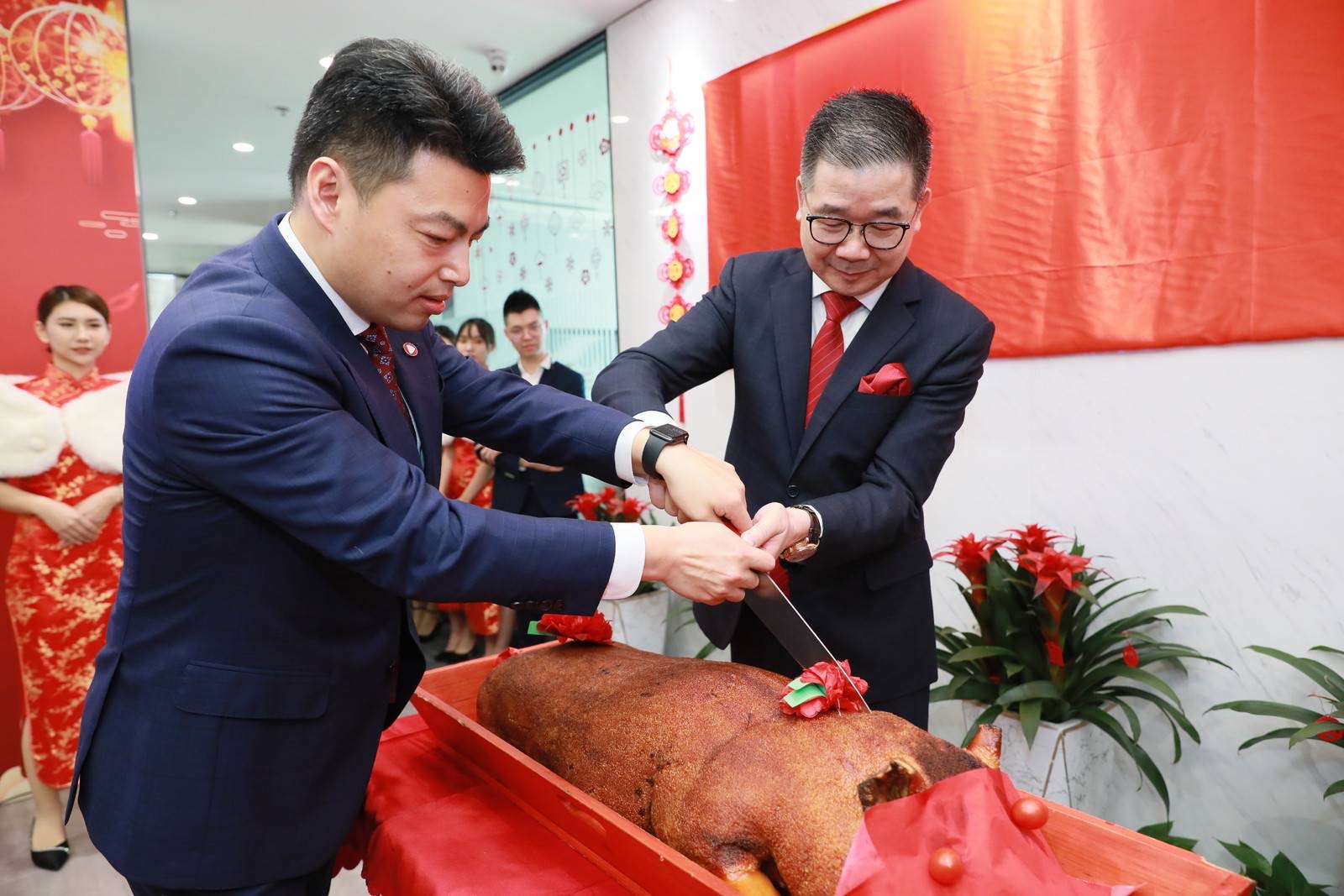 金猪送福,万泰开来。卓佳大中华区主席&卓佳·瑞豐德永创始人Mr. Mak、卓佳中国行政总裁 张海亮先生共切象征吉祥如意的烤乳猪,寓意红红火火,财源广进