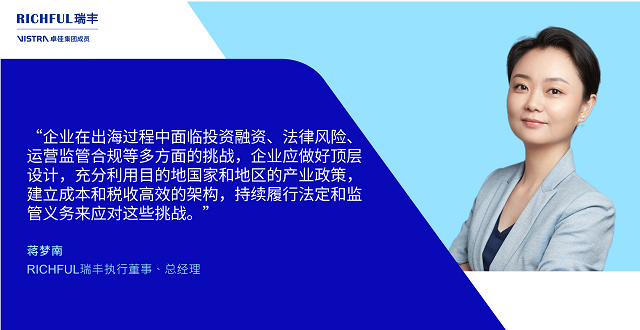 除了金融服务,企业出海还需考虑多方面因素。RICHFUL瑞丰执行董事、总经理蒋梦南与《中国经营报》记者分享,企业在出海过程中面临投资融资、法律风险、运营监管合规等多方面的挑战,企业应做好顶层设计,充分利用目的地国家和地区的产业政策,建立成本和税收高效的架构,持续履行法定和监管义务来应对这些挑战。