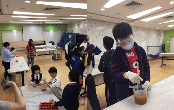 瑞丰德永集团义工先向专业导师学习制作环保肥皂的方法,随后协助导师一起教导小朋友。