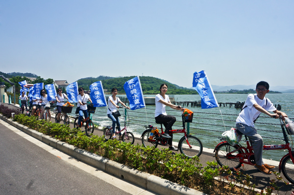 上午9:40活动正式开始,我们从东钱湖游客中心出发,每辆车后面都打出了统一旗帜,展示环??诤?,吸引了不少路人的驻足观看。