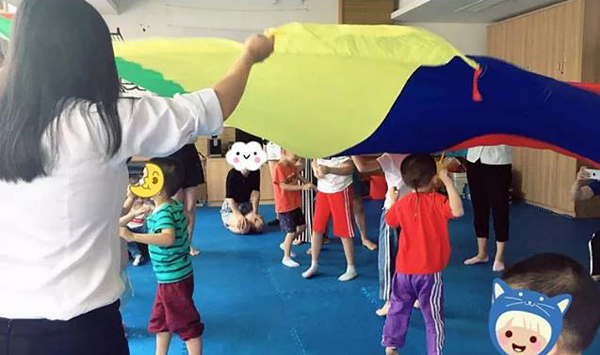 带着孩子们玩彩虹伞抓小鱼的游戏,孩子们的笑脸是对我们最好的回报