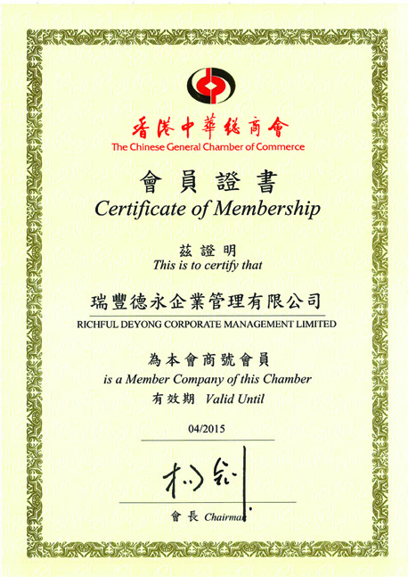 香港中华总商会颁发会员证书