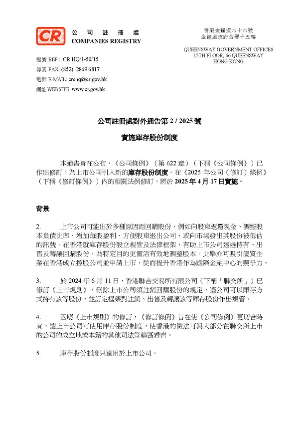 《公司条例》(第622章)已作出修订,为上市公司引入新的库存股份制度,让上市公司可以库存方式持有和处置回购的股份。在《2…