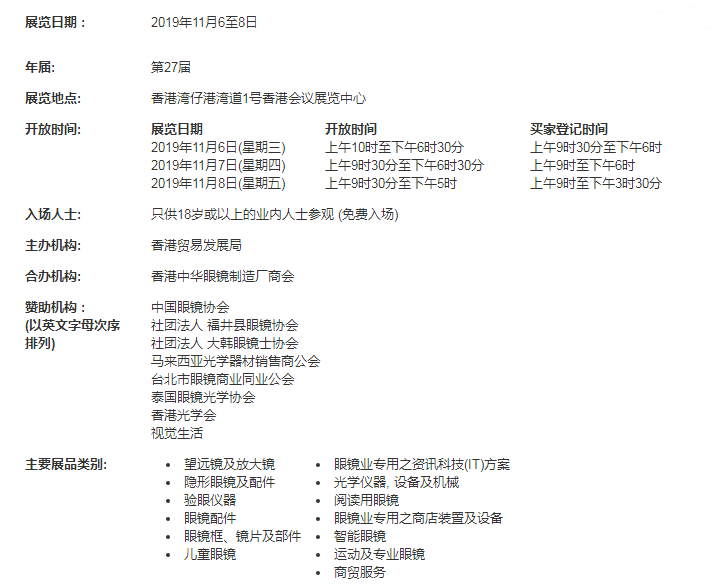 第27届香港贸发局香港国际眼镜展呈献无与伦比的优质商贸平台, 让参展商与环球买家建立联系。2018年眼镜展吸引来自111个国家及地区超过16,800名买家到场参观采购,较对上一年上升4%,并云集810家参展商,打破历届纪录。