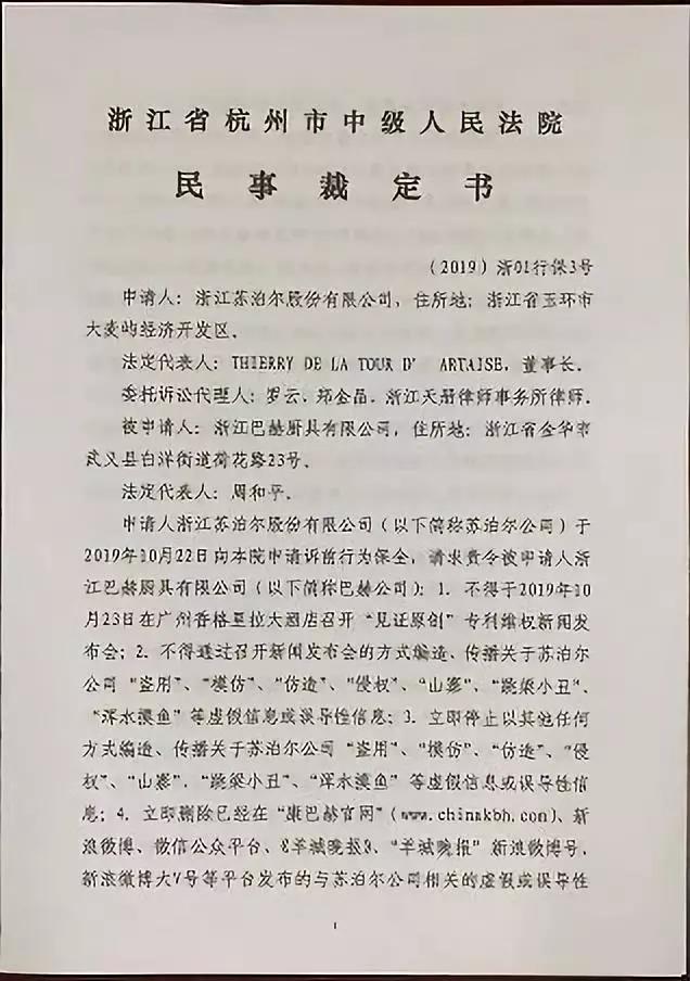 10月23日,苏泊尔即向浙江省杭州市中级人民法院以现金人民币300万元提起诉前行为保全担保,要求康巴赫立即停止可能影响苏泊尔公司商誉的不当宣传行为,这份《民事裁定书》赶在康巴赫举行新闻发布会前送达了康巴赫手中。