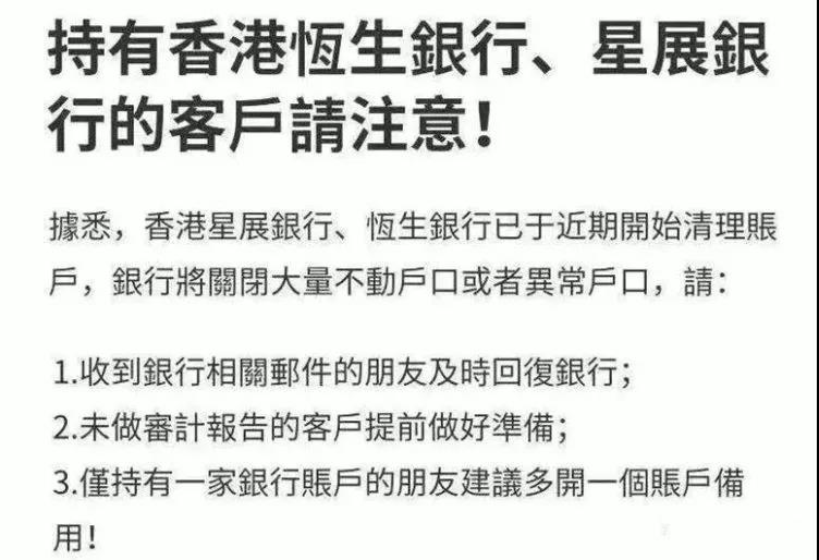 去年,恒生银行清理关停的离岸账户甚至超过了1万个,从这几年香港银行清理帐户的规律来看,通常持续时间约为4个月左右,从8月底开始到12月底结束。