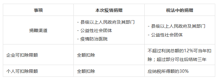 为了企业和个人更好地制定所得税税收计划,我们将本次疫情期间特殊捐赠和税法中的捐赠对比列示如下供您参考: