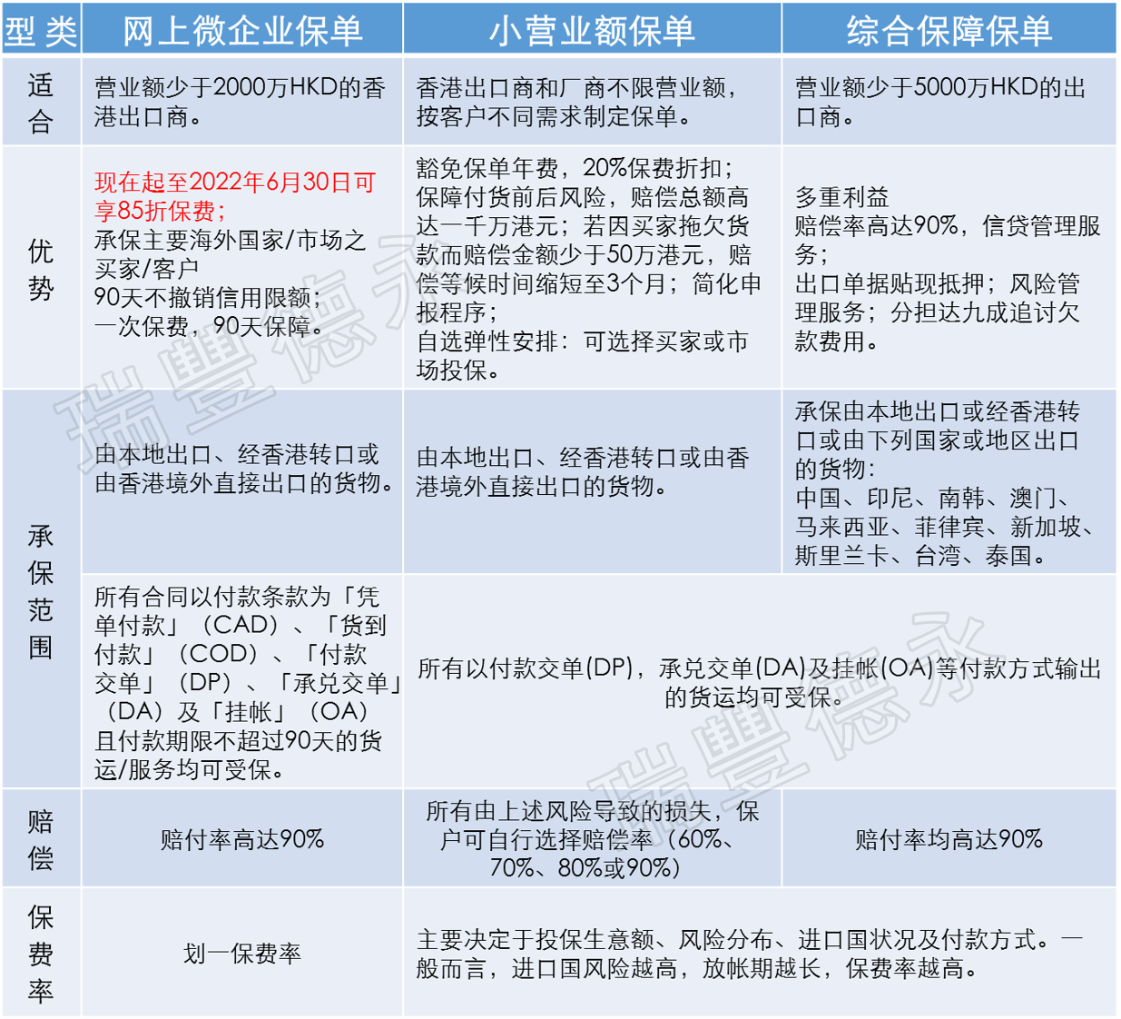 在全球此经济大背景下,涉及以上出口相关业务的您,应与专业人士及时了解出口信用保险,建议尽早配置,以规避风险、减少损失。此外,瑞豐德永在此特意提醒您,我们可为客户提供「免费信用评估」服务(信用额度是香港信保局在指定期内就该买家/客户可能承担的最高损失数额),为您获取香港出口信用保险局出具的信用评估报告。