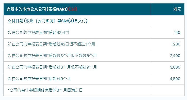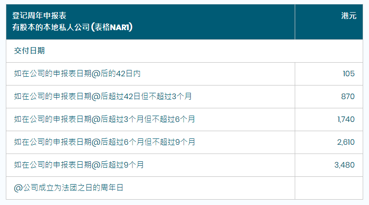 相关费用:私人公司、担保有限公司费用为105港元,公众公司为140港元。若逾期递交,则按5个梯度进行??睿词凳┙细叩牡羌欠?。