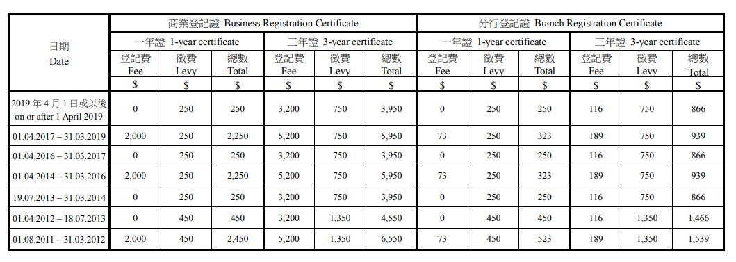 (税务局商业登记费及徵费收费表)