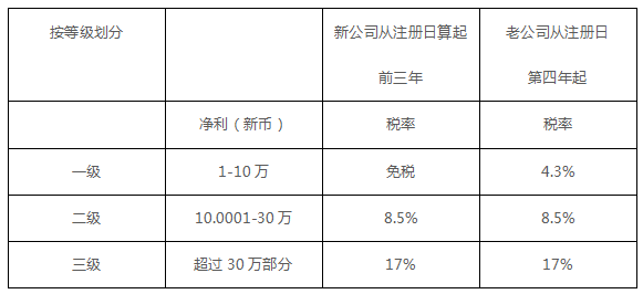 新加坡对企业所得税有许多减免与激励措施,其中包括对前三年少于1000万新币收入的小型企业免征所得税。