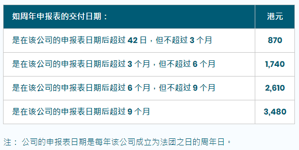 根据香港《公司条例》规定,若香港公司或非香港公司未有遵从相关条例交付周年申报表的规定,该公司及其每名责任人可被检控,一经定罪,可被处失责???。每次失责最高可被处??罡郾?0,000元。如持续失责,则可被处按日计算的失责罚款港币1,000元。