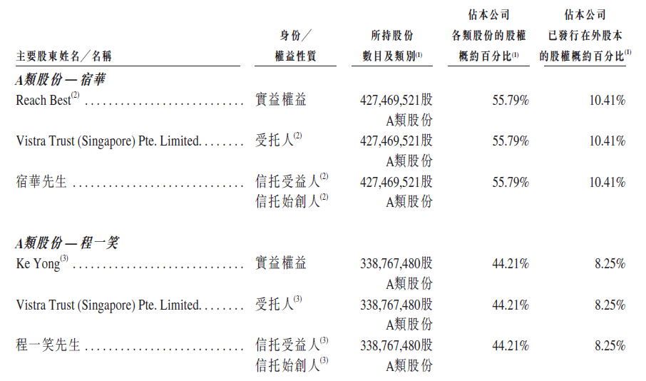 宿华与程一笑二人是快手的控股股东,两人同时拥有快手A类股份以及B类股份,宿华拥有55.79%A类股份,程一笑拥有剩余44.21%,其他投资者如腾讯、五源资本等皆为为B类股份。