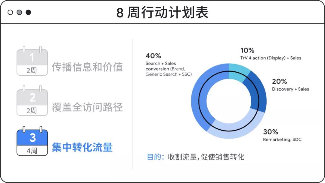 这个周期要把用户沉淀下来,收集再营销列表重新把用户拉回来并保持一定比例品牌传播的预算