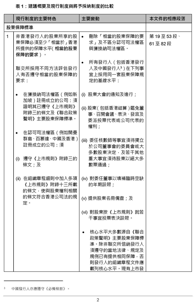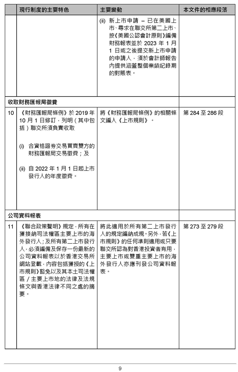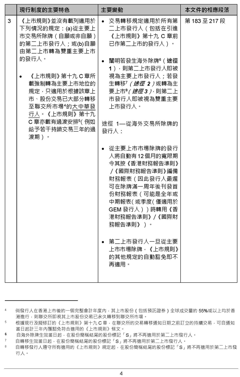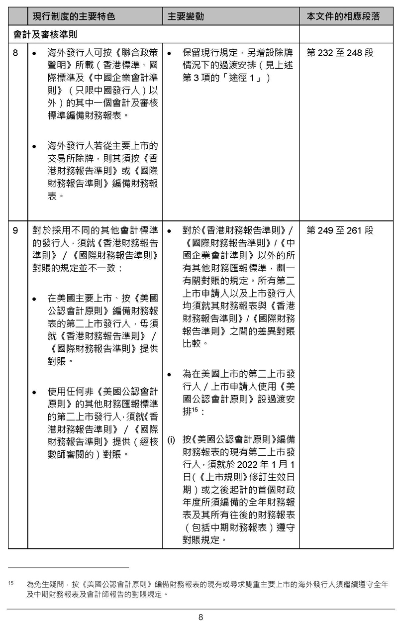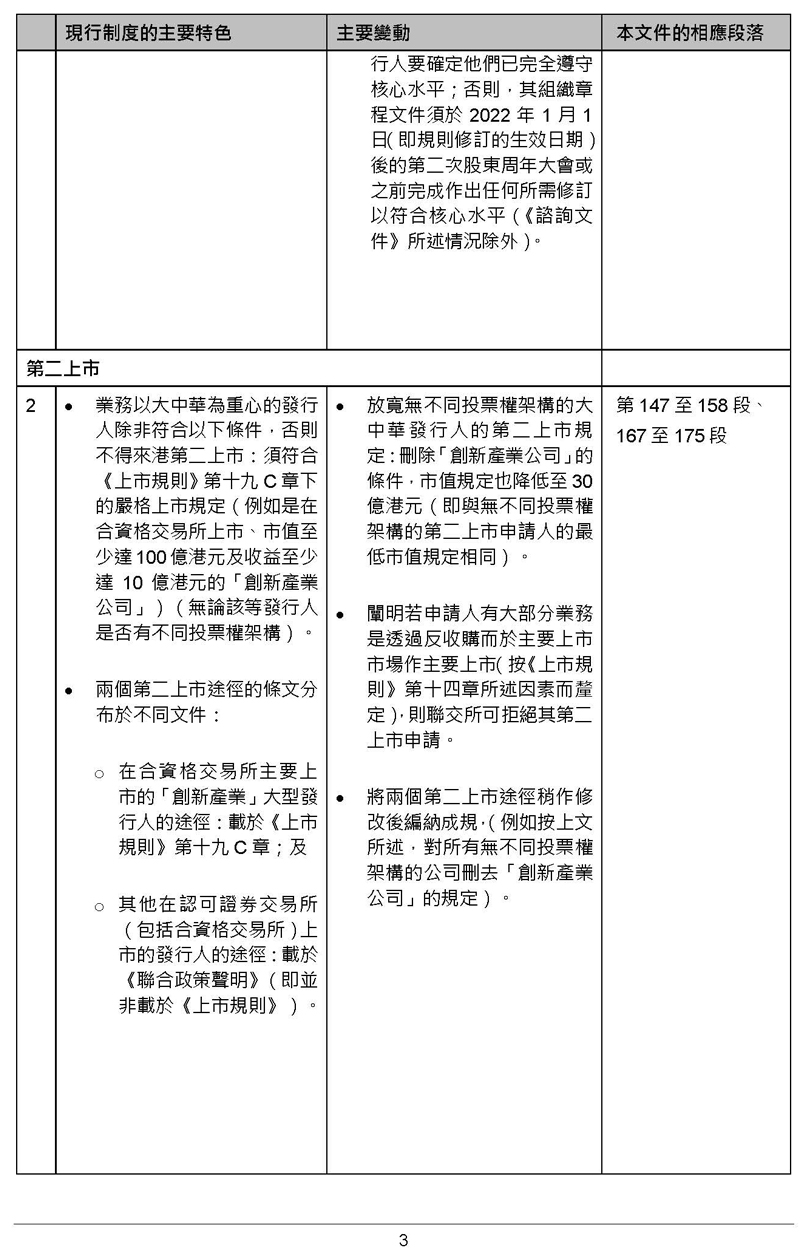 没有不同投票权架构的大中华发行人可作第二上市,而毋须证明其是“创新产业公司”,及上市时最低市值将改为30亿元港币(若能证明其在合资格交易所有至少五个完整会计年度的良好合规纪录)或100亿元港币(若能证明其在合资格交易所有至少两个完整会计年度的良好合规纪录)。