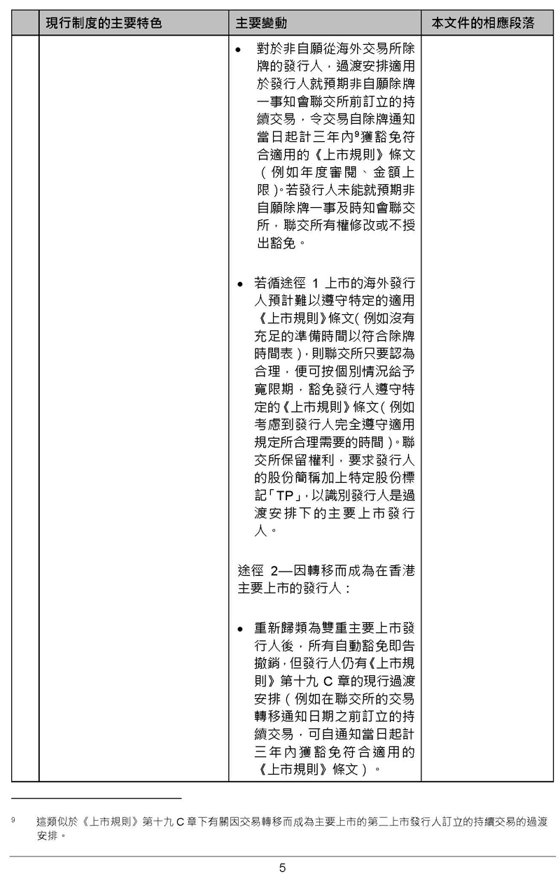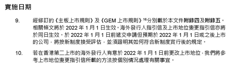 转为主要上市而成为双重主要上市发行人,所有自动豁免即告撤销;港交所一般不会就全面遵守《上市规则》条文给予宽限期。