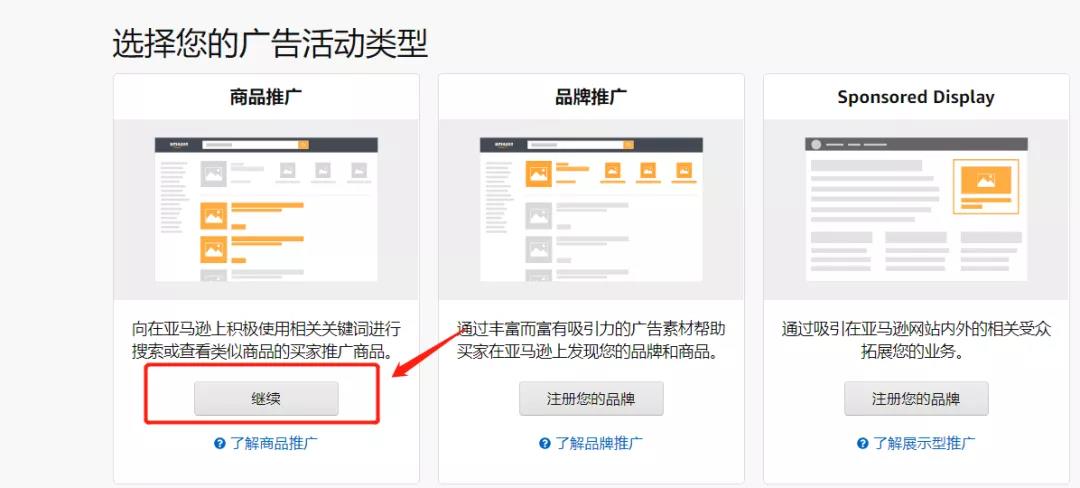 第三步:在新建广告活动页面,选择商品推广方式底下的【继续】,进入新建广告活动页面。