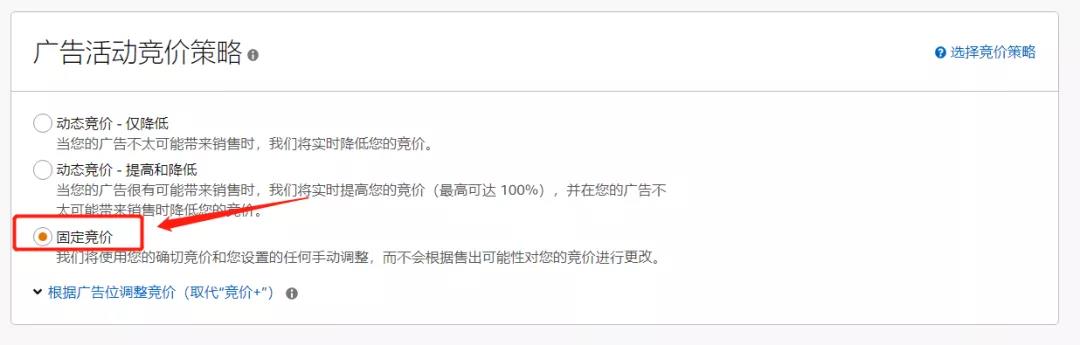 第五步:在【广告活动竞价策略】中,按照自己的商品投放要求进行设置竞价方式,新品的话建议是【固定竞价】。