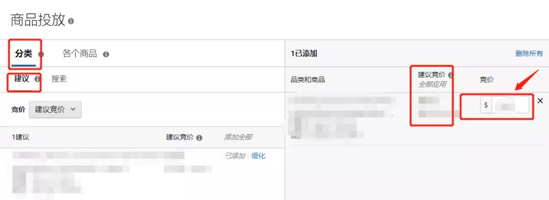 ①分类:在“分类”选项卡中,您可以根据与商品的相关性投放相应的推荐品类。按照建议竞价,设置合理的价格。