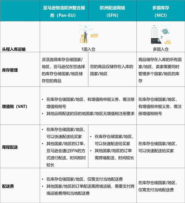 当您注册并上传了更多欧洲国家的VAT税号时,您可以根据自身需求,选择使用亚马逊物流欧洲整合服务(Pan-EU)和/或多国库存(MCI)。下图将这三种配送方式进行简单对比,供您参考。