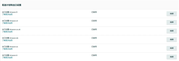 4.启用目的国亚马逊物流“配送计划和出口设置”(【设置】 > 【亚马逊物流】 > 【配送计划和出口设置】 > “已启用”);对于从欧盟(德国/法国/意大利/西班牙)到英国的欧洲配送网络,卖家需要在所有欧盟国家(德国/法国/意大利/西班牙)启用亚马逊物流“配送计划和出口设置”