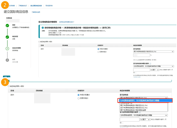 使用“建立国际商品信息”工具(BIL),并采用“与来源站点相同,根据税费和费用进行调整”的特殊自动定价规则。此规则会将来源店铺的价格与目标店铺的价格同步,以体现配送费用、税率和汇率,以及您对来源店铺价格所做的任何更改。