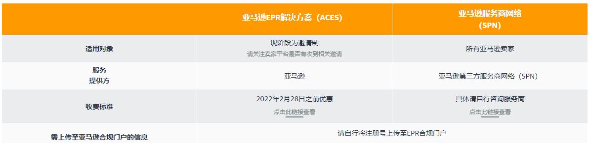 生产者责任延伸(EPR)是一项环境政策,要求生产者对其在市场上所推出商品的整个生命周期负责,即从商品设计开始到商品生命周期结束(包括废弃物收集和处理)。自 2022 年起,如果您要在法国/德国销售商品,亚马逊将有义务确认您在销售商品所在的国家/地区是否符合生产者责任延伸(EPR)的要求。因此,亚马逊将会收集并验证您的 EPR 注册号。