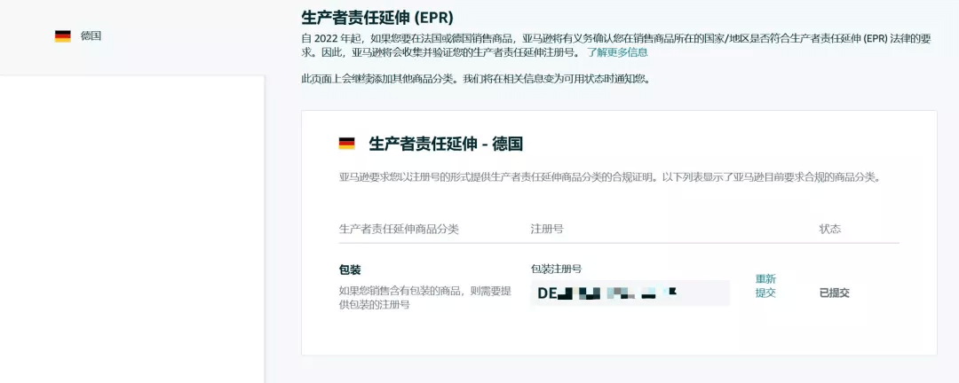 在此阶段,您只能为德国的包装分类添加 LUCID 编号。如果您销售的产品符合其他EPR商品分类,您也需要对其进行注册并上传。亚马逊预计将在2022年2月为法国卖家提供上传链接,德国的电子与电气设备(WEEE)预计将会在2022年3月开放收集,届时将通知您。