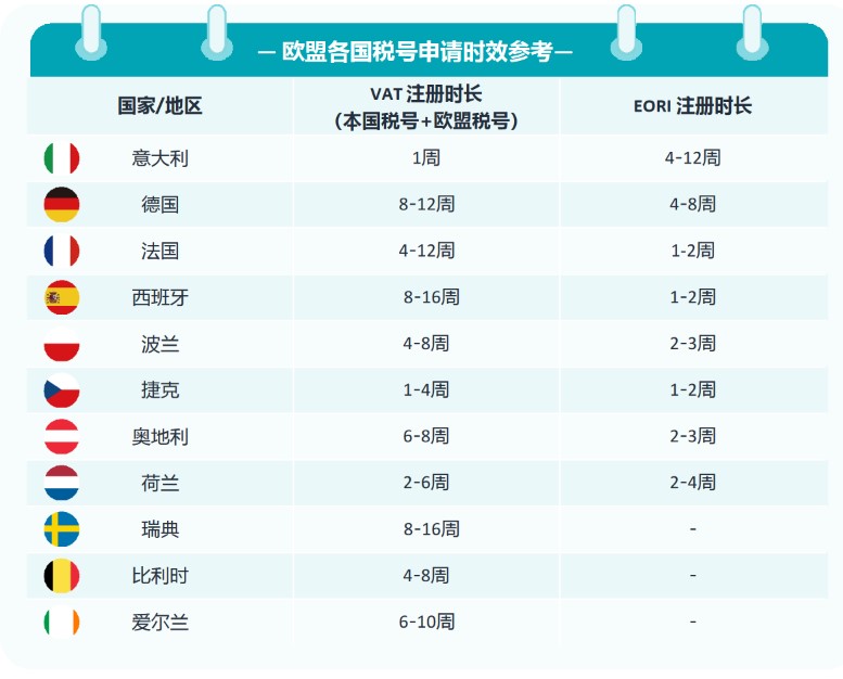 答:欧盟各国增值税税号注册时长不一(请见下方“欧盟各国税号申请时效参考”)