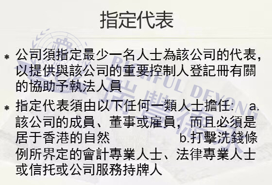 这里需要重点关注一下“公司指定代表”的几个重要条件,现在市场很多小的香港公司注册中介和代理可能无法达到上述要求,因此在办理“备存重要控制人登记册”的时候,一定要找符合条件和资质的机构来做,否则可能出现钱花了事情未办妥的情况。
