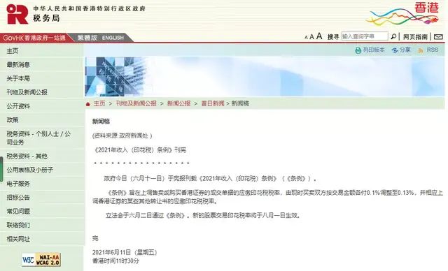 2021年8月1日起,香港《2021年收入(印花税)条例》实施,香港公司股份转让印花税率由0.2%调升至0.26%。