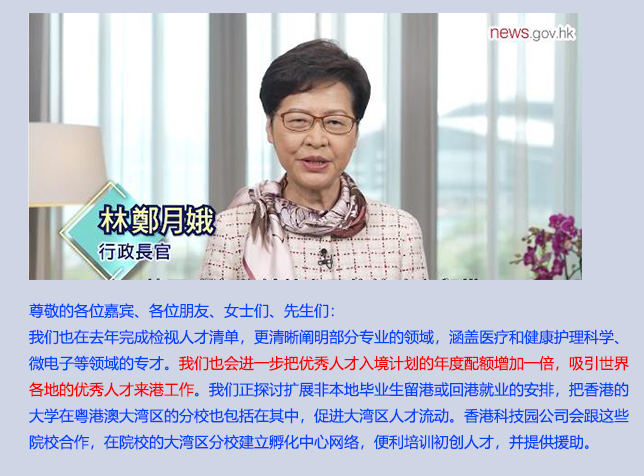 在第20届中国国际人才交流大会上,前行政长官林郑月娥表示,本届政府锐意配合国家十四五规划,把香港建设成为国际创新科技中心。在吸引人才上,优秀人才入境计划年度配额将倍增,当局并正探讨扩展非本地毕业生留港或回港就业的安排。