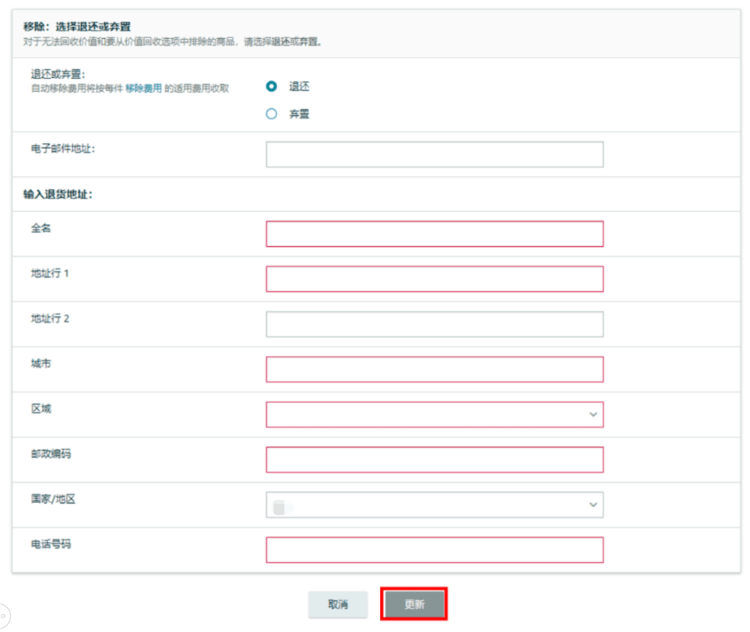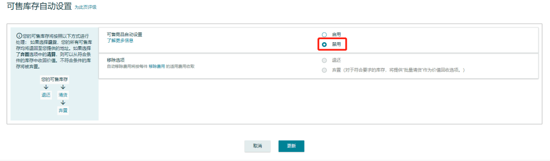 1、若您希望通过“自动移除”定期清理您的超龄和闲置库存并退回至指定地址,您需要在该页面提供您的退货地址,再点击【更新】完成设置。