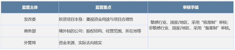 根据相关法规要求,境内非国有企业进行境外直接投资,投资项目需要获得商务部门的核准或备案、发改委的核准或备案、外管局登记备案才能进行境内资金的合规出境;国有企业需额外向国资委递交审批报备。