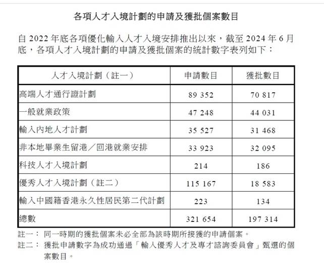 从目前数据来看,港府已经超额完成吸引人才“指标”。据立法会披露的文件,截至2024年6月底,经过各项人才入境计划共接收了超过32万份申请,其中近20万宗申请已获批准,超过13万名人才已经抵达香港。根据香港入境事务处最新公布的统计数据,2024年第一季度,成功获批的申请案例数量上升至2,735宗,较去年同期增加了662宗,实现了约32%的显著增长。