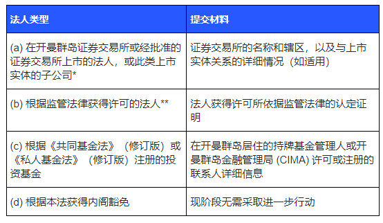 若您位于开曼群岛的实体,按照此次修改前的法规被视为不在约束范围内或享受豁免权益,则须尽快对其进行评估,确定该实体是否符合以下标准之一: