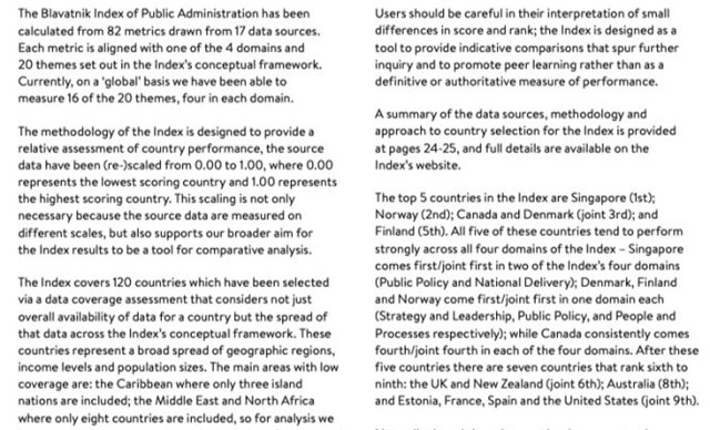英国牛津大学的布拉瓦尼克政府学院于2024年12月5日公布了最新布拉瓦尼克公共行政指数报告(Blavatnik Index of Public Administration),比较了全球120个国家的公共管理部门。新加坡民事服务全球居冠。新加坡在边境服务、税务管理创新策略和实践方面领先全球其他国家。