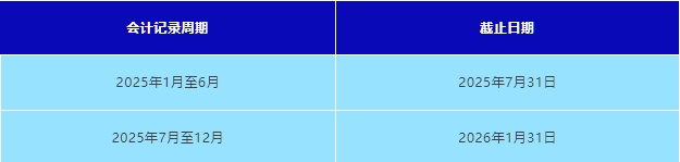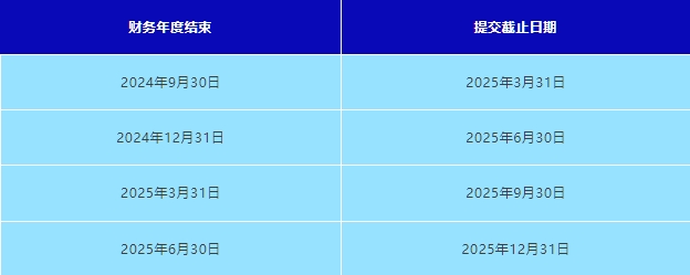 在财务年度结束后6个月内提交。大型实体和非大型非控股实体必须准备年度财务总结,并保存在其注册办公室。常见截止日期: