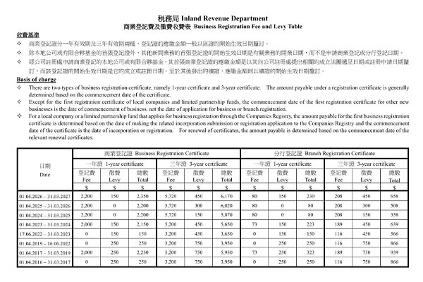 根据税务局公布的收费表,在 2026年4月1日至2027年3月31日  期间开始生效的商业登记证,应缴费用如下: