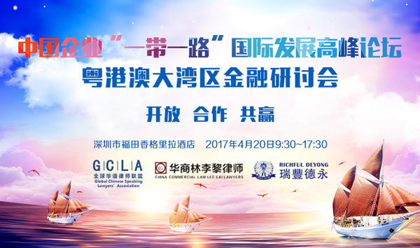 2017中国企业“一带一路”国际发展高峰论坛暨粤港澳大湾区金融研讨会,由全球华语律师联盟、华商林李黎(前海)联营律师事务所及瑞丰德永集团联合主办,深圳市对外贸易企业发展促进会、深圳市国际投资促进中心、深圳市前海企业服务有限公司、深圳市电子商务协会共同协办,深圳市前海香港商会作为支持单位,是首次以粤港澳大湾区金融发展为主题的国际性高峰论坛,将于2017年4月20日在中国深圳举办,特邀请您出席!